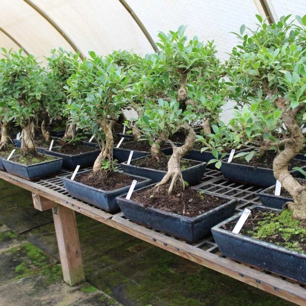 Auffällig bei diesen Feigenbonsai sind die vielen Luftwurzeln, die die Pflanzen bei hoher Luftfeuchte bilden. Die Luftfeuchte kann man durch Besprühen erhöhen.