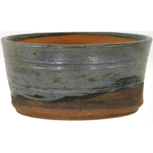 Bonsaischale (Glasiert, Stahlblau-Braun, Rund), handgemacht, in den Abmessungen: 16cm Länge, 16.5cm Breite, 7.5cm Höhe.