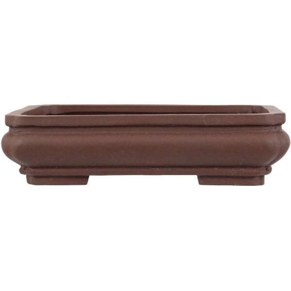 Bonsaischale (unglasiert, braun, rechteckig), handgemacht, in den Abmessungen: 20.5cm Länge, 15cm Breite, 5cm Höhe.
