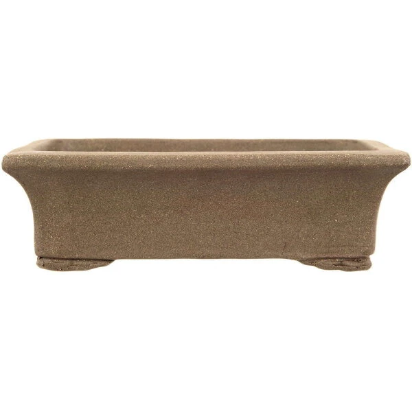 Bonsaischale (unglasiert, grau, rechteckig), handgemacht, in den Abmessungen: 21cm Länge, 14.5cm Breite, 6cm Höhe.