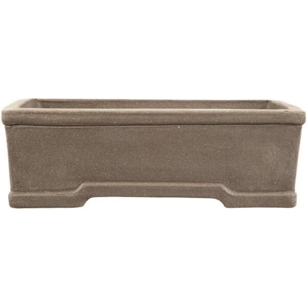 Bonsaischale (unglasiert, grau, rechteckig), handgemacht, in den Abmessungen: 26cm Länge, 19cm Breite, 8.5cm Höhe.