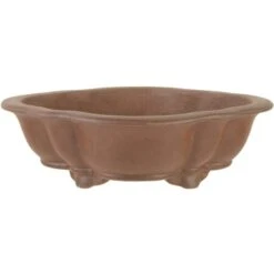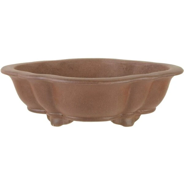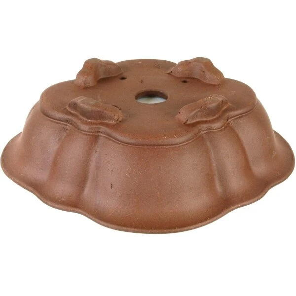 Bonsaischale (unglasiert, antik-braun, lotusförmig), handgemacht, in den Abmessungen: 26cm Länge, 23.5cm Breite, 8cm Höhe.