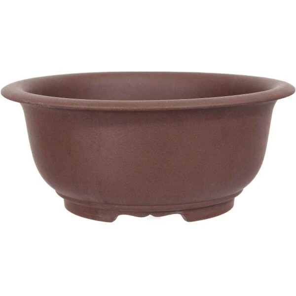 Bonsaischale (unglasiert, braun, rund), handgemacht, in den Abmessungen: 27.5cm Länge, 27.5cm Breite, 11.5cm Höhe.