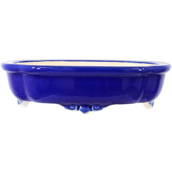 Bonsaischale (Glasiert, Blau-Dunkel, Lotusförmig), handgemacht, in den Abmessungen: 33cm Länge, 27cm Breite, 9cm Höhe.
