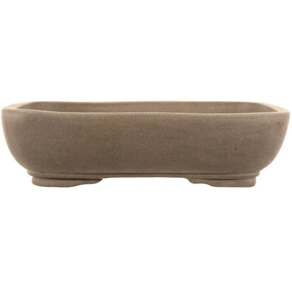 Bonsaischale (unglasiert, grau, rechteckig), handgemacht, in den Abmessungen: 37cm Länge, 28cm Breite, 10cm Höhe.