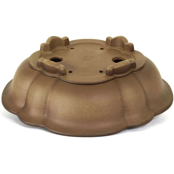 Bonsaischale (unglasiert, antik-grau, lotusförmig), handgemacht, in den Abmessungen: 39.5cm Länge, 34.5cm Breite, 11cm Höhe.