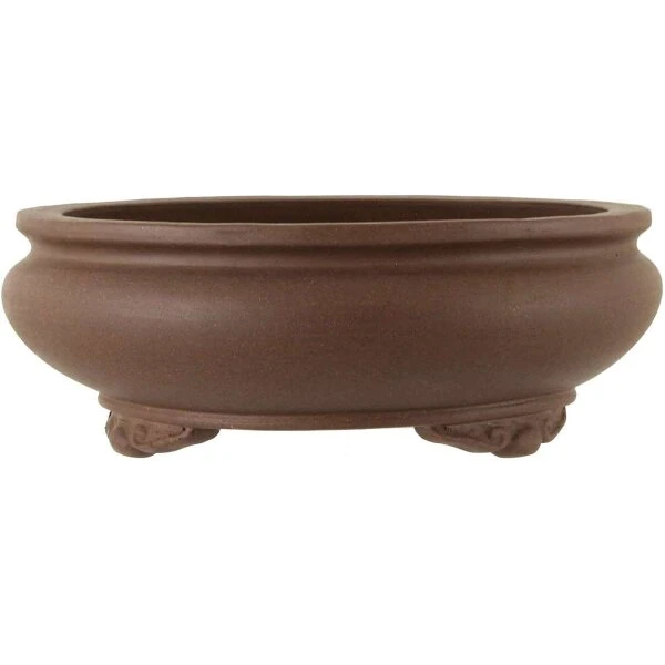 Bonsaischale (Unglasiert, Braun, Rund), handgemacht, in den Abmessungen: 39cm Länge, 39cm Breite, 14cm Höhe.