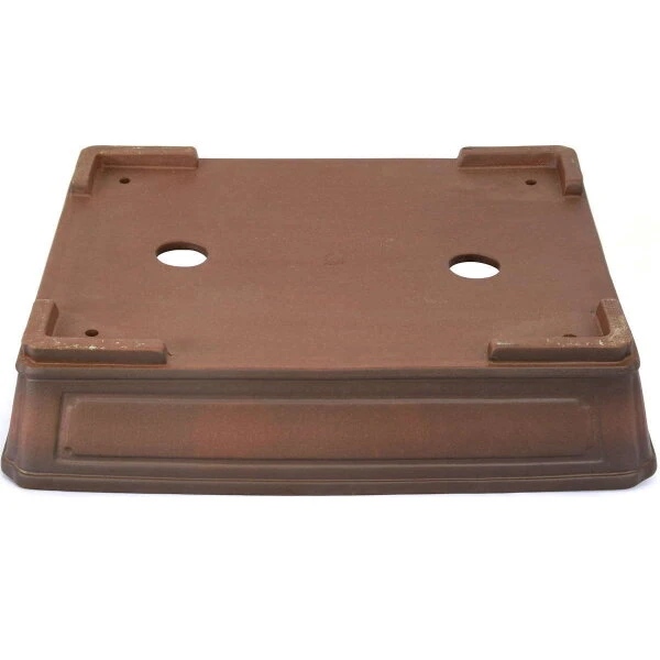 Bonsaischale (unglasiert, antik-braun, rechteckig), handgemacht, in den Abmessungen: 45.5cm Länge, 36.5cm Breite, 10cm Höhe.