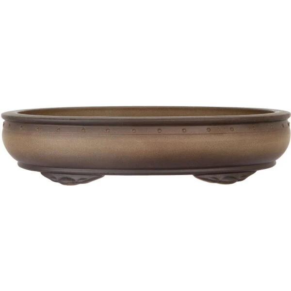 Bonsaischale (unglasiert, antik-grau, oval), handgemacht, in den Abmessungen: 45.5cm Länge, 36.5cm Breite, 10cm Höhe.