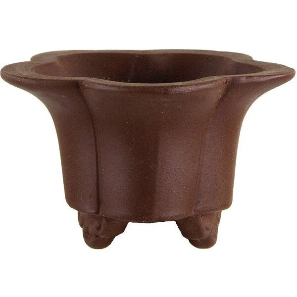 Bonsaischale (Unglasiert, Dunkelbraun, Lotusförmig) in den Abmessungen: 7.2cm Länge, 7.2cm Breite, 4.5cm Höhe.