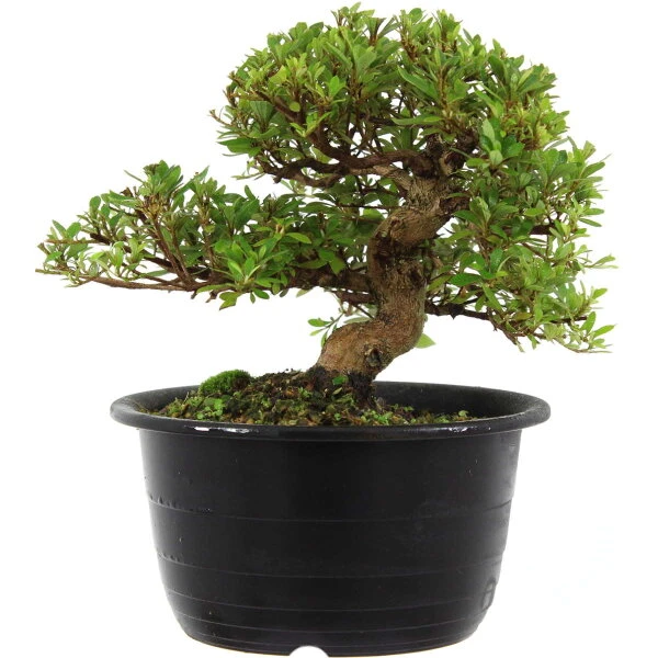 18 Jahre alte Japanische Satsuki Azalee (Sorte: Sachin) in einer Kunststoff Bonsaischale. Dieser Bonsai ist ca. 28cm hoch und wurde aus einer japanischen Bonsaigärtnerei importiert.
