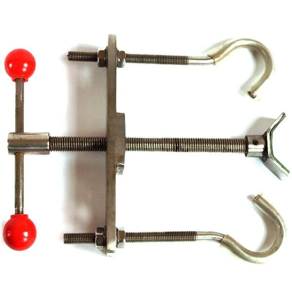 Grosse, nichtrostende Schraubzwinge zum schonenden Biegen von bis zu 4cm starken Ästen.