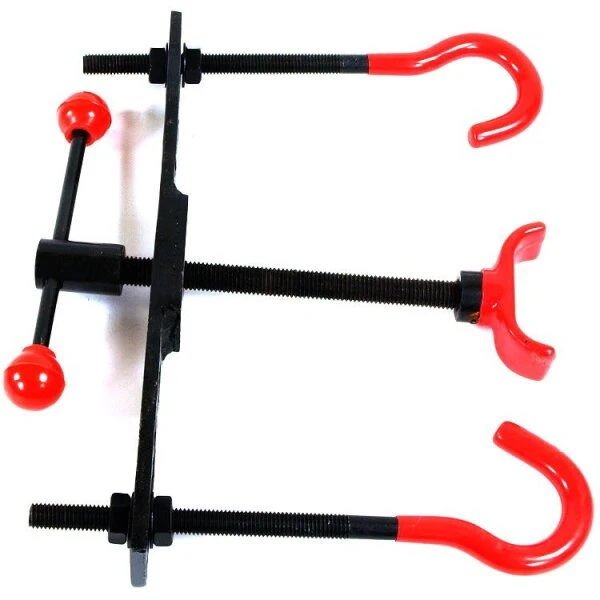 Sehr grosse, nichtrostende Schraubzwinge zum schonenden Biegen von bis zu 4.5cm starken Ästen.